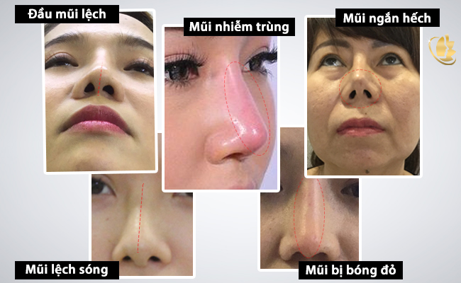 ➨ Mũi lệch, cong vẹo, mũi lộ sống, lộ đầu mũi, viêm nhiễm, đầu mũi bóng đỏ.